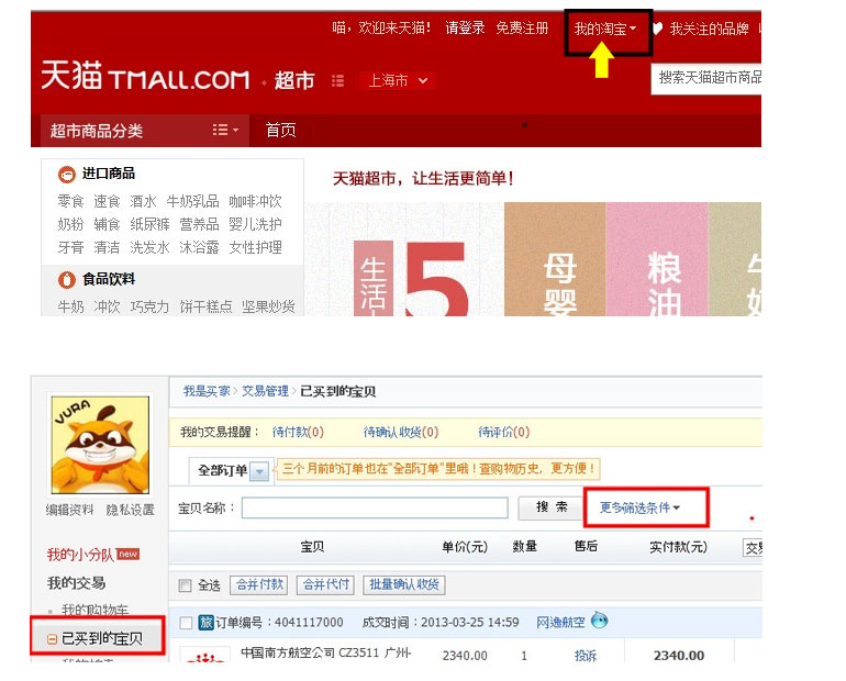 您可以进入“我的淘宝”,点击“已买到的宝贝”页面查看您所有的购买记录,如要精确查找,可点击“更多筛选条件”(如图)。